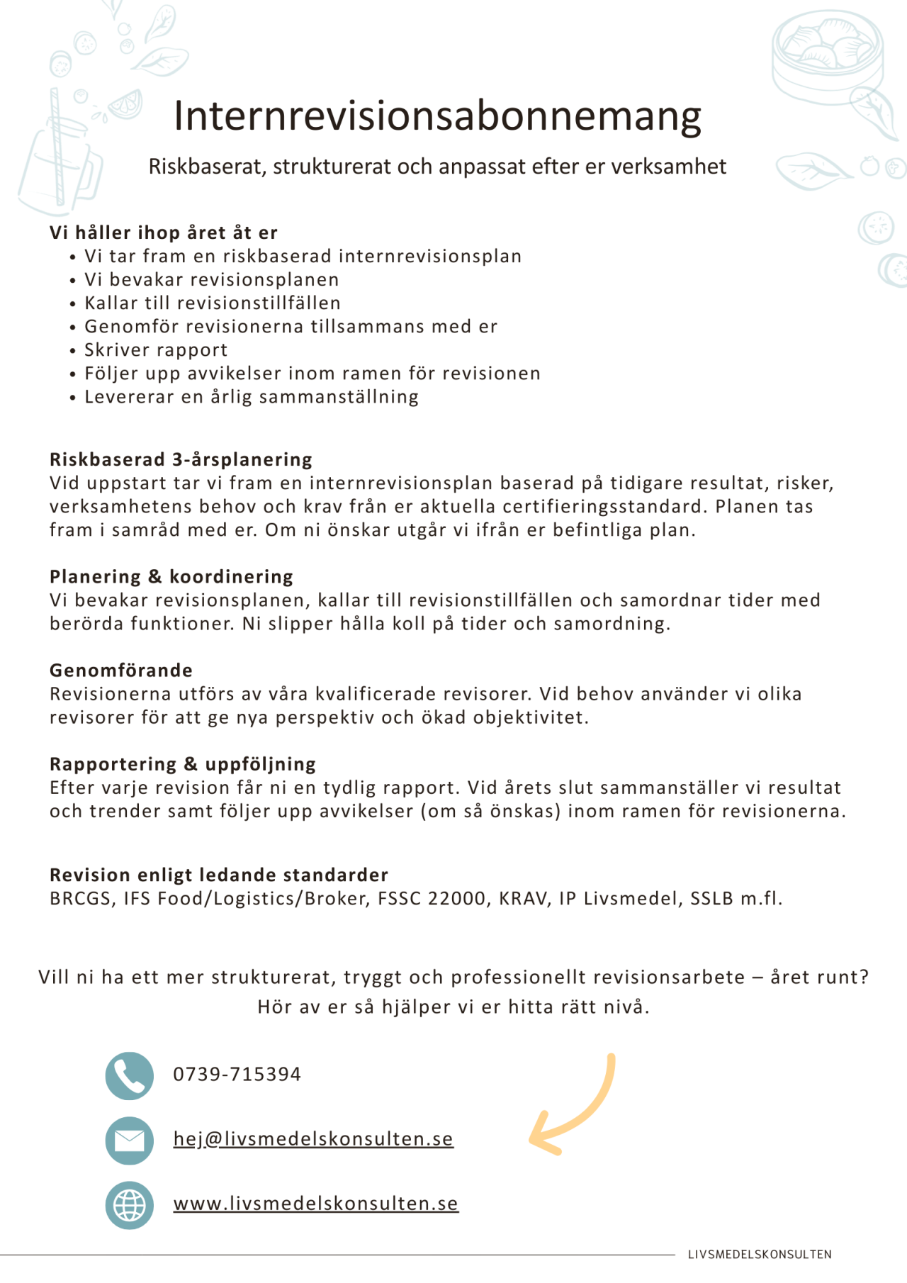 Vi hjälper livsmedelsföretag med kvalitetsarbetet och vår expertis ligger inom livsmedelstandarder. Vi kan kliva in som er kvalitetsansvarig och sköta hela systemet eller hjälpa till med punktinsatser inom certifieringar, internrevisioner, GAP-analyser, märkning/etiketter och utbildningar.